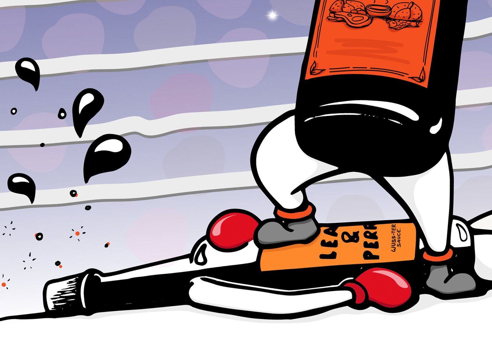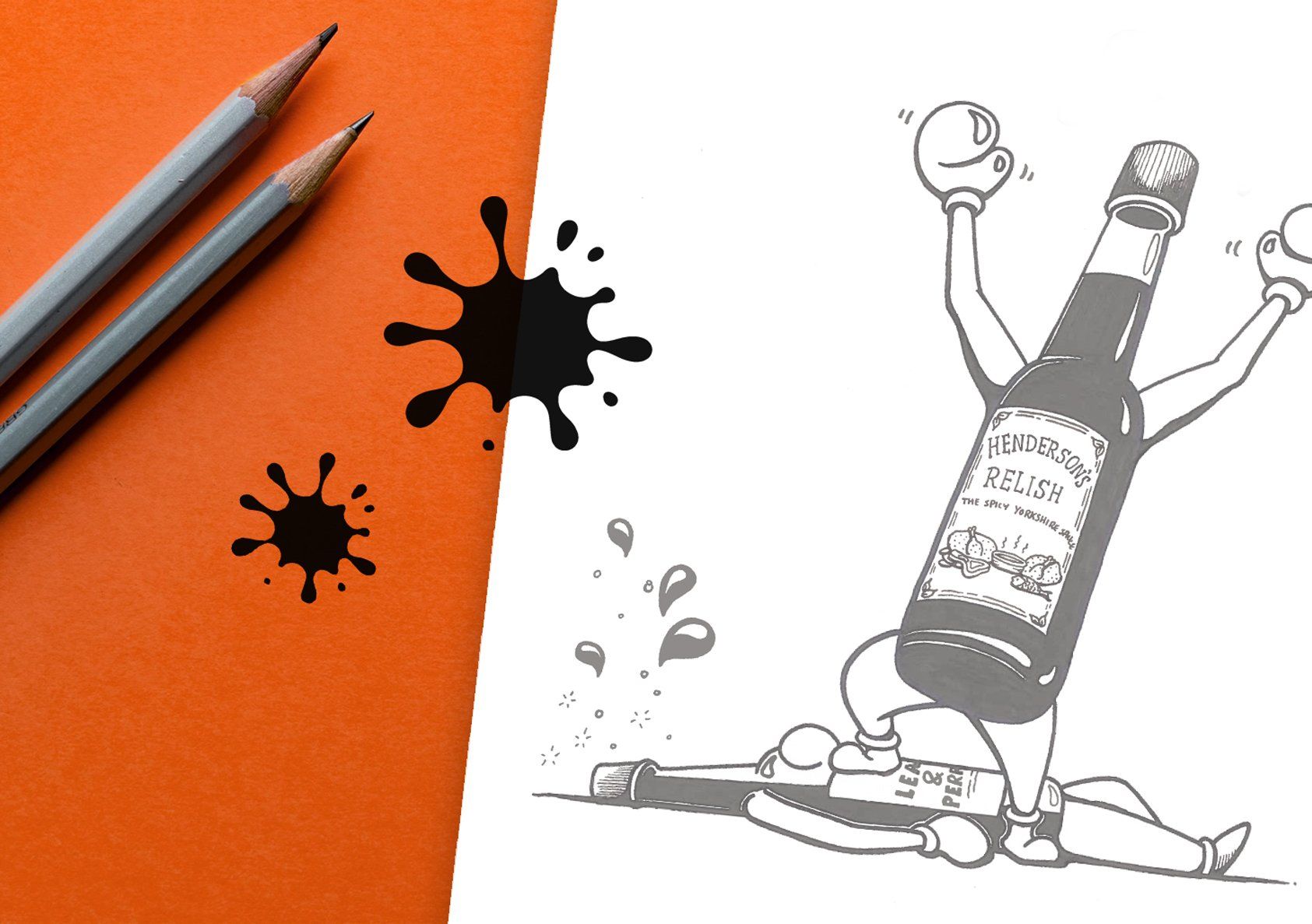 It's been a friendly rivalry between Wuss-ter Sauce and our hometown champ, Hendo for a while now. Some think they're the same thing, but they really are two very different heavyweights. I wanted to sketch something which gave a tongue-in-cheek nod to the competition between them. Both are good, but nevertheless, nothing compares to our Knockout Sauce, Heavyweight Condiment of the World!